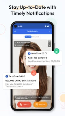 factoTime is an attendance app also known as a time tracking or attendance app for employees. With this app, you can capture employee attendance with selfies, time, and location.