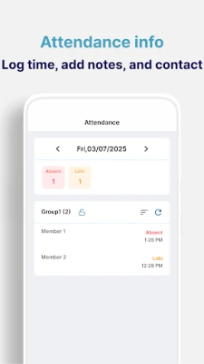 - Set attendance messages tailored to each situation - Supports multi-check and group sharing - View statistical data by period and individual using saved attendance records - Make calls, send text messages, add notes, and record attendance times - Import lists from contacts or type them manually - Export attendance data as Excel files