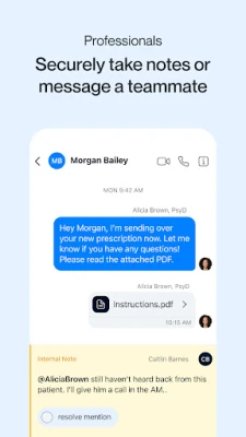 • Team collaboration: Secure team chats, shared inboxes, internal notes, and @-paging bring the features of modern team software to the healthcare space