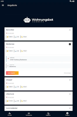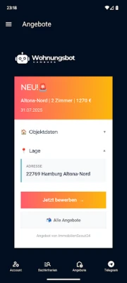 Du suchst eine Wohnung in Hamburg? Dann ist die Wohnungsbot Hamburg App dein perfekter Begleiter! Unsere App scannt rund um die Uhr alle großen Immobilienportale automatisch nach neuen Mietangeboten in Hamburg - ganz nach deinen individuellen Suchkriterien (z. B. Stadtteil, Mietpreis, Wohnungsgröße).